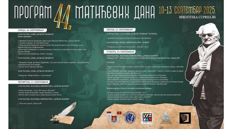 Read MoreOпштина Ћуприја позива све суграђане и госте да се придруже обележавању успомене на великог уметника Душана Матића, на 44. Матићевим