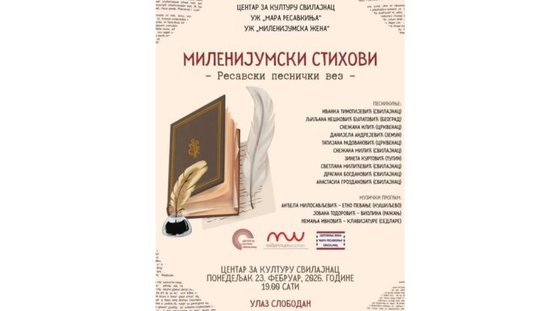 У организацији Центара за културу Свилајнац, у сарадњи са удружењима жена „Мара Ресавкиња“ и „Миленијумска жена“, у понедељак, 23. фебруара 2026. године, са почетком у 19 часова, биће одржано књижевно вече под називом „Миленијумски стихови – Ресавски песнички вез“. Улаз је слободан.