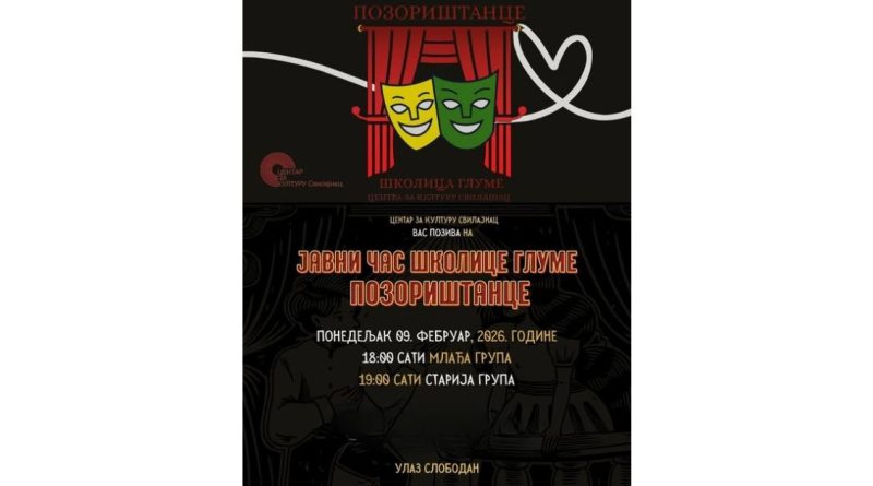 У Центру за културу Свилајнац, у понедељак 9. фебруара, биће одржано вече посвећено најмлађим љубитељима позоришта и њиховом стваралаштву. Након три месеца рада, учења и заједничког дружења, полазници позоришног студија „Позориштанце”, који делује под вођством глумице Марије Стокић, изаћи ће на сцену и представити резултате свог труда. Програм почиње у 18 часова наступом млађе групе, док ће старија група публици показати своје умеће од 19 часова, а улаз је слободан.