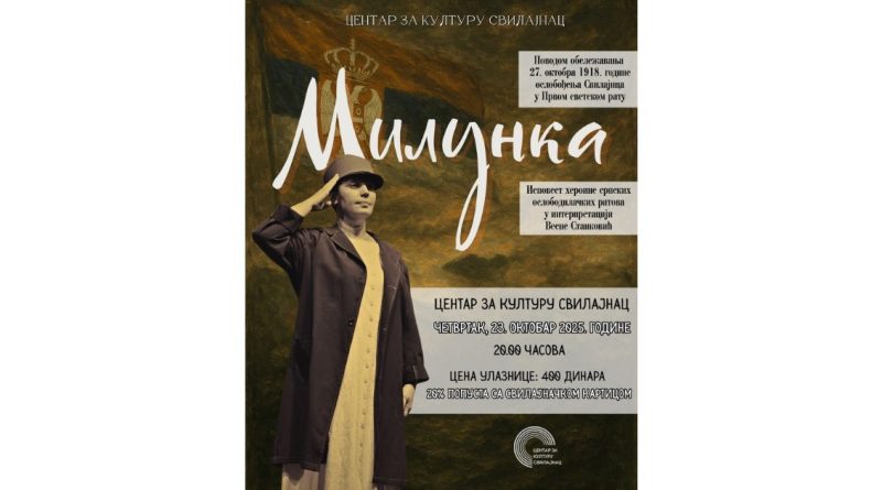 Поводом обележавања 27. октобра 1918. године, дана када је Свилајнац ослобођен у Првом светском рату, Центар за културу Свилајнац припрема посебан културни догађај који ће публици приближити лик и дело најодликованије жене ратника у историји српског народа – Милунке Савић.