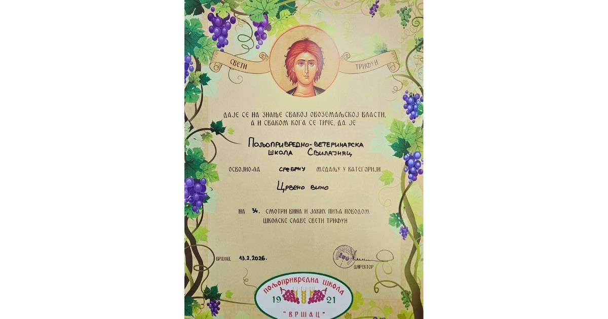 Ученици и наставници школе из Свилајнца остварили су значајан резултат, освојивши четири сребрне медаље. Признања су додељена за квалитет црвеног вина, белог вина сорте шардоне, белог вина тамјаника, као и за ракију од грожђа.